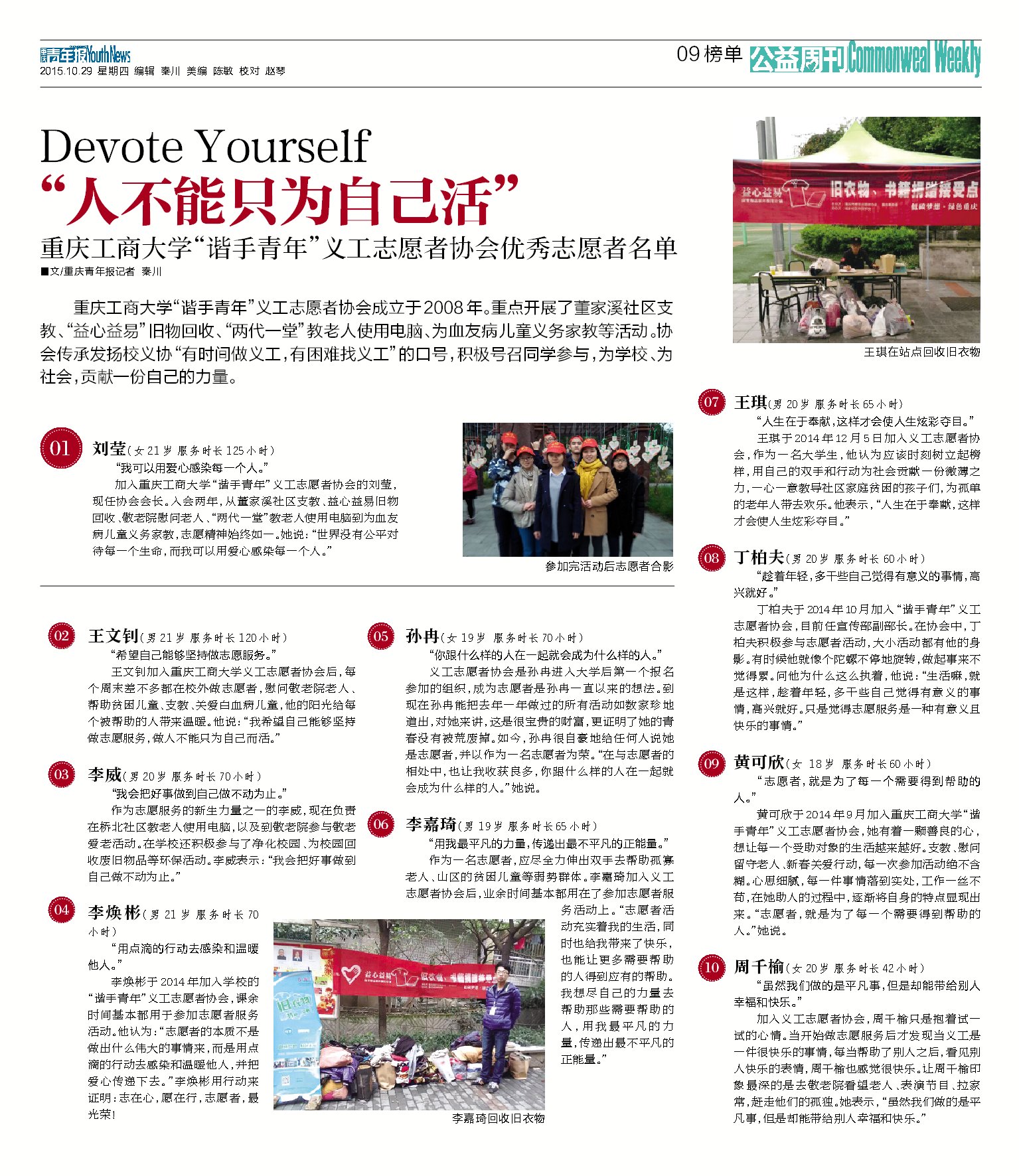 公司英国365上市公司影视动画分院于2008年成立“谐手青年”义工志愿者协会。一直以来,全体志愿者们全心全意致力于为社会贡献自己的爱心与力量!重点开展了董家溪市民公司支教、“益心益易”旧物回收、“两代一堂”教老人使用电脑、为血友病儿童义务家教等活动。该义协传承校义协“有时间做义工,有困难找义工”的口号,积极号召同学们参与志愿者服务活动,为公司、社会奉献自己的青春和力量!重庆青年报于