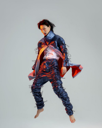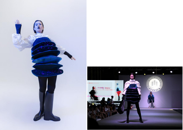 灵感源于声音,当我开始记录声音时发现声音背后丰富的故事,对此进行一系列的调研与实验,设计表达手法以立体结构和褶皱为主,运用烫金手法修饰色彩。采用创新廓形、色调变化丰富的复合丝绒面料辅以功能性涂层面料来凸显其未来感。