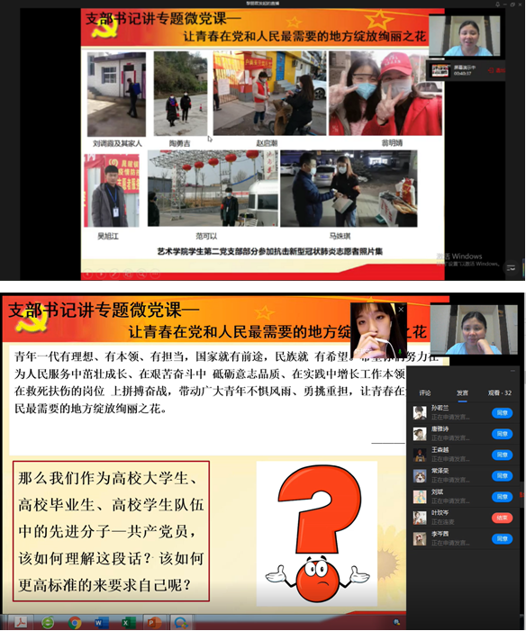 支部书记跟大家汇报了本支部的党员、入党积极分子、入党申请人在抗击新冠肺炎期间开展的志愿服务小故事,重点讲解了崔敬博同志参与的志愿活动,包括崔敬博同志在家乡河北省邯郸市曲周县的抗击新冠肺炎的先进事迹以及大学期间他参与的重庆市多个单位组织的志愿活动,累计志愿服务时长达817小时。这些发生在我们身边的先进事迹让我们对青年一代如何奉献自己的力量有了更深的感触。