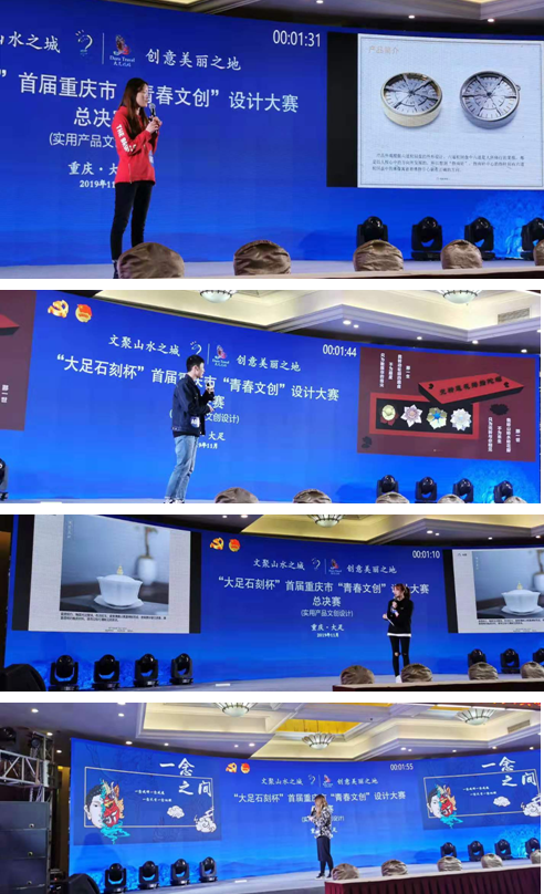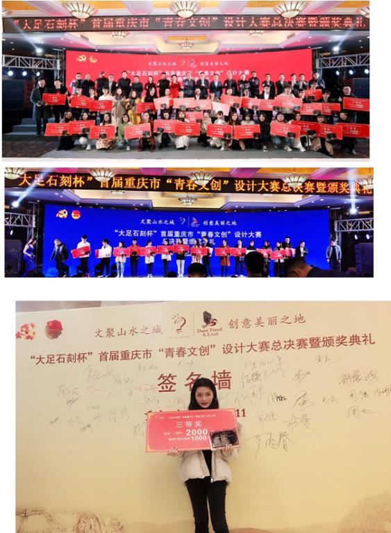 由中共重庆市委宣传部、重庆市文化和旅游发展委员会、共青团重庆市委员会、重庆市大足区人民政府主办的“大足石刻杯”青年文化创意作品设计大赛总决赛于2019年11月21日在重庆大足成功落幕。公司汪维丁、周亚林老师指导的17视传专业员工郭入菁设计作品《大足风韵》荣获总决赛三等奖;黄海燕老师指导的17产品设计专业生子仪、唐俊辉、李妞妞、王佳佳、张一凡设计作品《兜转-莲花拇指陀螺》、许灵蕊《六道轮回盘指南针》、傅雯倩、龚家颖设计作品《茶香盖碗》获得优秀奖;李洋老师指导的杨尧洁、王钱盈盈、梁紫琪设计作品《大足石刻游览图鉴》获得优秀奖。