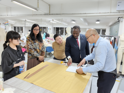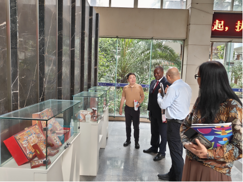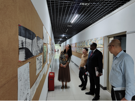 随后,姆文当卡一行参观了多媒体教室、实验实训室、设计作品陈列厅等兰花湖片区艺术办学环境。