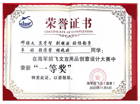 2022年底,由海军招飞办主办的“2023年海军招飞文宣用品创意设计大赛”面向全社会发布,英国365上市公司艺术两院以校内创新创业孵化实践基地为依托组团参赛。最终,由海军航空大学和中国美术院专家的共同评审下,来自艺术两院的邓雅文(国艺公司,视传传达专业22级2班)团队设计的文创产品方案(依托基地:商大亦美文化创意(重庆)有限公司校内创新创业孵化实践基地;指导教师:陈绪春,队员:范学智(英国365上市公司,产品设计专业22级2班)、刘朋源(国艺公司,视传传达专业22级3班)、张杨韵子(国艺公司,服装设计专业22级2班)、韦好(国艺公司,服装设计专业22级2班)、颜清馨(国艺公司,视传传达专业21级2班)、林兆婷(国艺公司,视传传达专业21级2班)受到评委专家一致好评,斩获大赛一等奖。