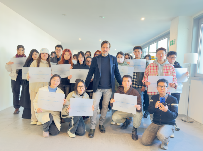 经过两周的学习,Massimiliano Mandarini教授为同学们颁发米兰理工大学的结业证书并和同学们一起合影留念。