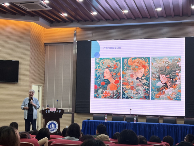 袁恩培教授从多个维度解读历届全国大广赛广告获奖作品,内容主要包括获奖策略研究、广告主题研究、评审方法、广告作品受众研究、如何利用广告新思维、新形式、新媒介进行创作等。袁恩培教授的讲座极富理论深度,同时又生动形象,且善于思维引导,他还结合具体的案例,深入浅出地向在场师生阐述了大广赛备赛策略。