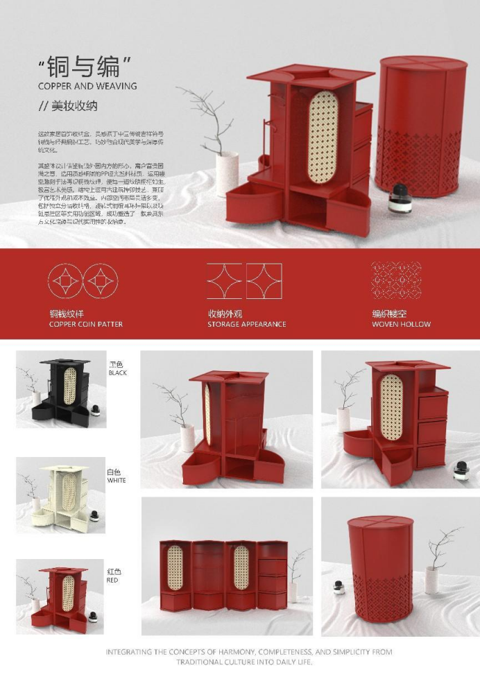 刘瑶、李元琴、王小蓉团队的作品“铜与编”以其独特的设计理念和精湛的工艺水平在众多参赛作品中脱颖而出。该作品在需求研究、概念方向、功能应用、创新因素、环保安全以及可实现性等方面均得到了评审委员会的高度认可。作品不仅体现了对美好生活的深刻理解,更展现了新时代工业设计的创新理念,赢得了评委和观展受众的一致好评。