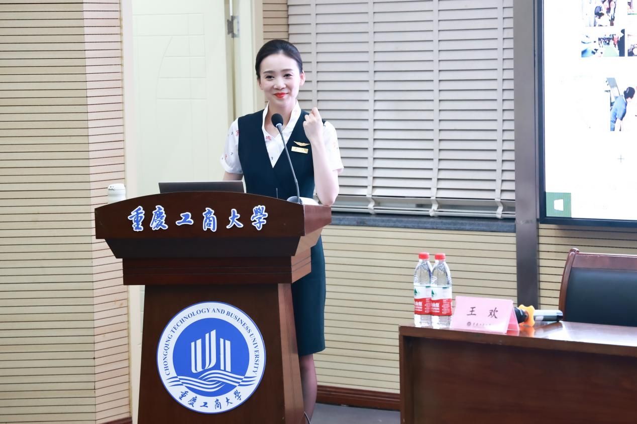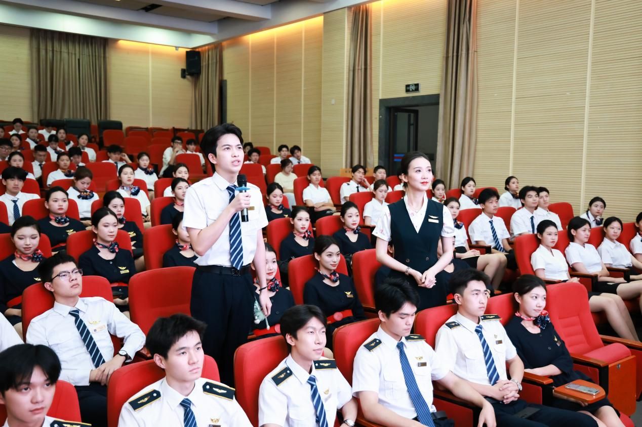 王欢乘务长从多个角度详细解析了中国民航的蓬勃发展及背后的运营模式。她介绍了中国民航近年来的发展历程,阐述了行业规模的不断扩大和技术的持续革新。同时,结合自身丰富的从业经验,深入讲解了乘务员在航班运营中的具体职责和工作内容。此外,王欢乘务长向两院师生讲解了在企业环境中乘务员的管理和职业发展路径。她指出,乘务员的职业不仅需要具备良好的专业素养和服务意识,还需在工作中不断提升自身的管理能力和应对突发情况的能力。