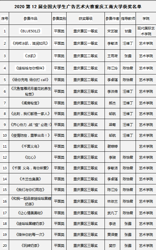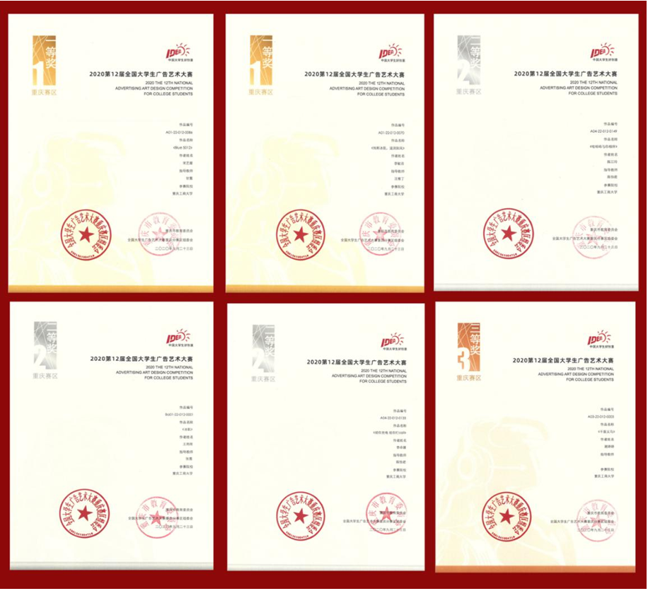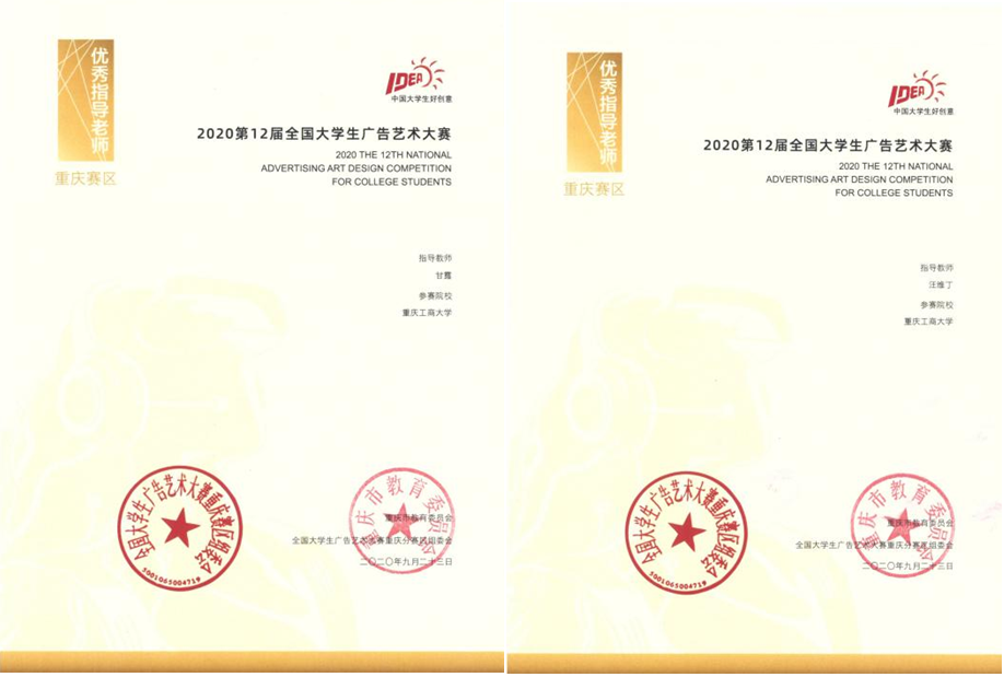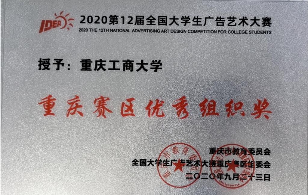 公司师生获得重庆市教育委员会与全国老员工广告艺术大赛重庆赛区组委会颁发的一等奖2项、二等奖3项、三等奖15项、优秀奖54项,甘露与汪维丁老师获得优秀指导教师奖,英国365上市公司获得重庆市教育委员会颁发的重庆赛区优秀组织奖。