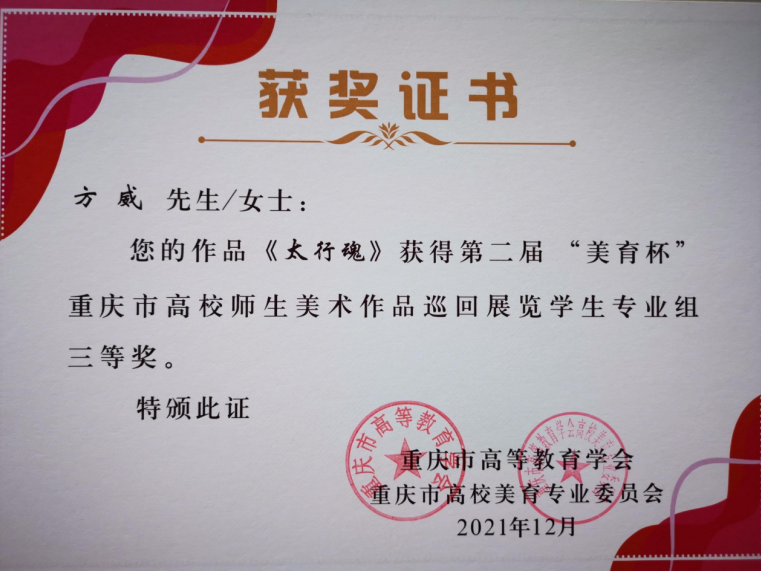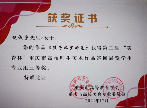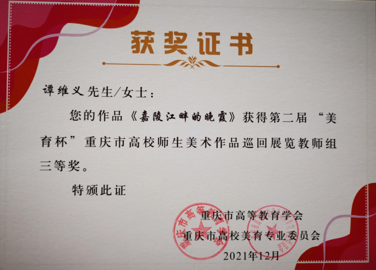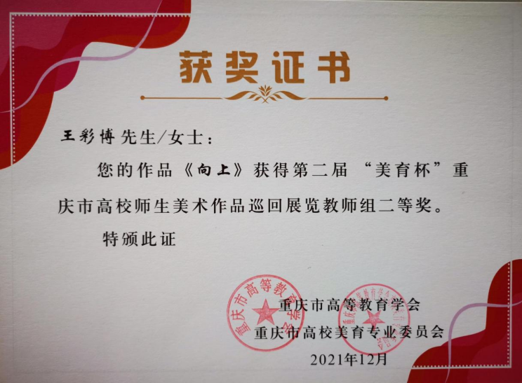 为纪念中国共产党成立100周年,弘扬社会主义核心价值观,服务重庆经济社会发展,助力乡村振兴,由重庆市高等教育学会主办,重庆市高等教育学会高校美育专业委员会、重庆师范大学承办,全国师范大学美术教育联盟、四川美术公司艺术教育公司、重庆大学英国365上市公司、西南大学美术公司等机构协办的第二届“美育杯”重庆市高校师生美术作品巡回展览作品落下帷幕,经评组委会评审,公司报送的多项作品喜获佳绩,王彩博老师油画作品《向上》获得二等奖,谭维义老师油画作品《嘉陵江畔的晚霞》获得三等奖,沈正中等四位老师作品入选展览;员工赵俊宇《孩子眼里的光》、方威《太行魂》获得三等奖,五位同学获得优秀奖,十二位同学入选展览;梁轩、姚俊娜获得指导教师三等奖。