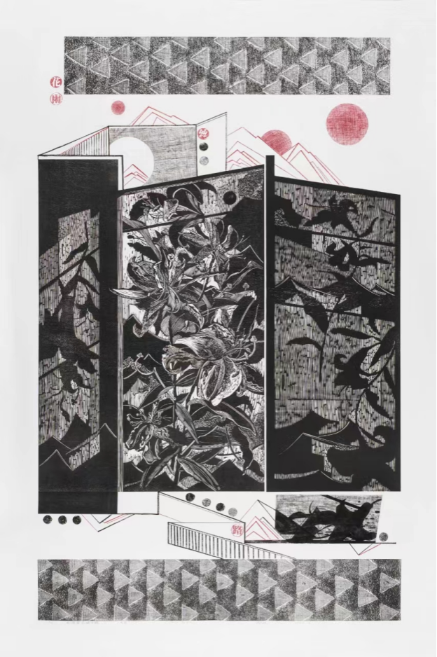 作品简介: 版画作品《丝路繁花映日晖》以习近平总书记提出的共建“一带一路”倡议为创作主旨,意在展现古老的丝绸之路留给人们的美好印象和想象,唤起人们对美好未来的憧憬。该作品形式感强,刀法的穿插变化形成丰富的黑白灰关系;红色的直线增加了画面的层次;大小各异的圆点并置其间,使画面更为活跃。主体折叠的屏风象征历史长河中的无数故事、无尽思索;怒放的百合花代表几千年的丝绸之路文明史辉煌而灿烂;红色线条勾勒出的层层山峦,象征人类伟大历史不断接力的道路,是历史最悠久、空间最广阔的道路,也是通向美好未来的道路;冉冉升起的红日象征祖国的明天更加繁盛璀璨,继续书写当代“丝路”,全面创新文明交流的新篇章。