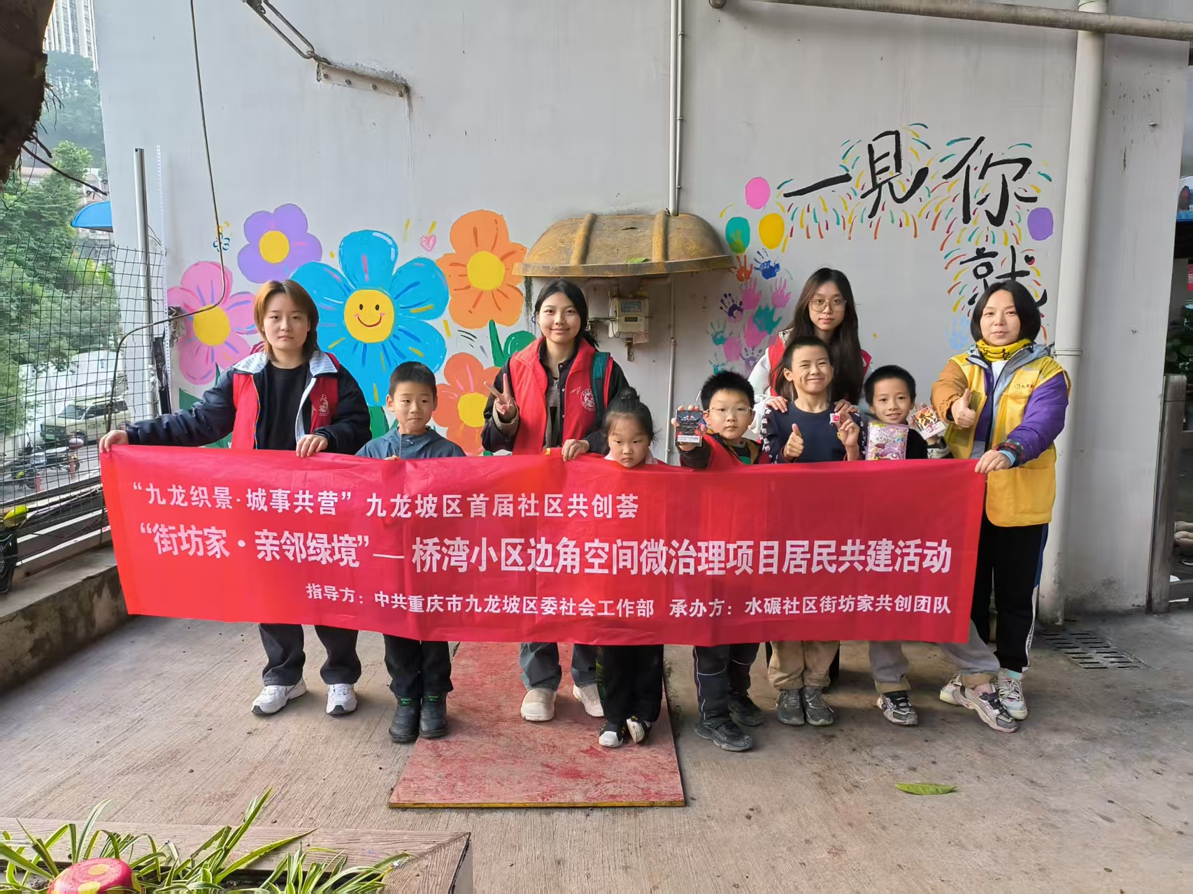 2025年11月22日,九龙坡区水碾社区桥湾小区内暖意融融、色彩飞扬。由公司党员服务站、功能型社区党支部与水碾社区联合发起的“街坊家亲邻绿境”边角空间微治理项目居民共建活动顺利举行,党员服务站的同学们与社区小朋友携手挥毫,用数十平方米的创意墙绘为老旧小区的闲置角落注入文明活力与艺术温度。