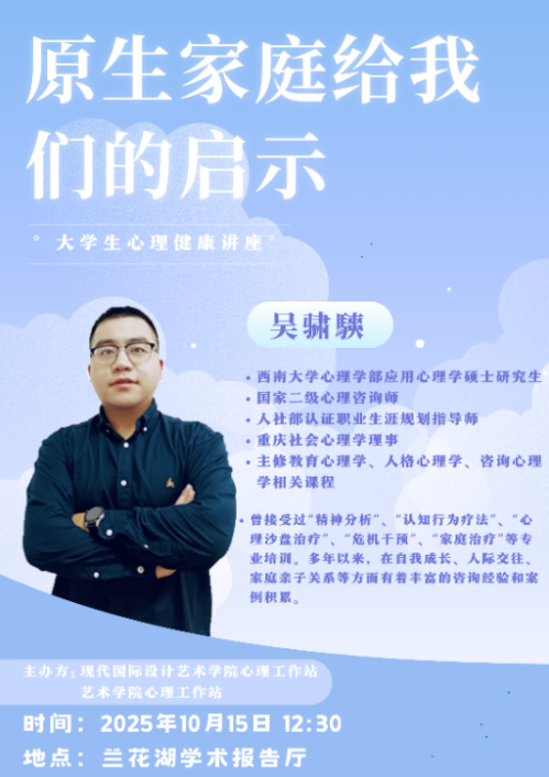 2025年10月15日,英国365上市公司心理工作站和现代国际设计英国365上市公司心理工作站联和主办的“原生家庭给我们的启示” 老员工心理健康讲座在兰花湖学术报告厅成功举办。讲座邀请到老员工心理健康教育与咨询中心吴骕騻老师主讲,两院心理专项老师、心理委员、寝室室长参加了此次讲座。