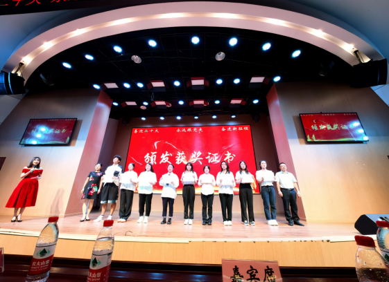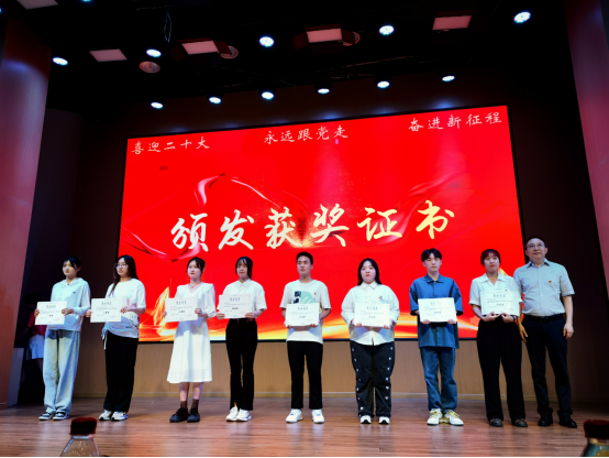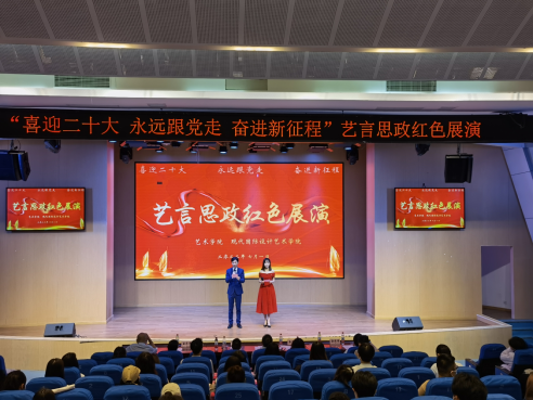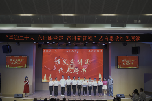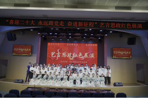 本次艺言思政红色展演共分为两个环节。在成果展示环节中,首先由艺术两公司党史教育宣讲队带来了红色党史故事分享,李国军副董事长为宣讲队成员代表颁发了聘书。随后分别进行了“喜迎二十大,政治生日践初心”政治生日贺卡视频展示,“绘百年党史 忆峥嵘岁月”红色人物绘画获奖作品视频展示等活动内容,由宣传部部长华杰、学工部副部长陈龙国、校团委副书记胡婧婷依次为获奖同学颁发了获奖证书。在文艺演出环节中,由艺术两院师生带来的红色歌曲《错位时空》追忆了革命峥嵘岁月的历史征程;红色舞台剧《传承》演绎了老中青三代传承红色基因,赓续红色血脉的故事;集体朗诵节目《党的“二十大”之歌》歌颂了党和国家的光辉历程,站在新的历史起点上催人奋进最后,活动在合影留念中圆满结束。